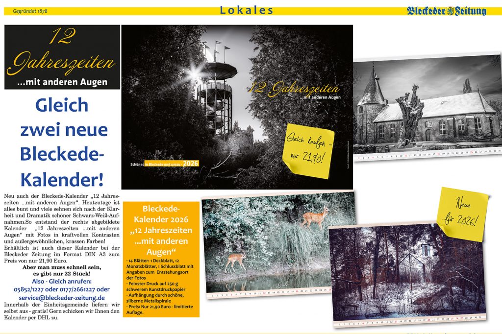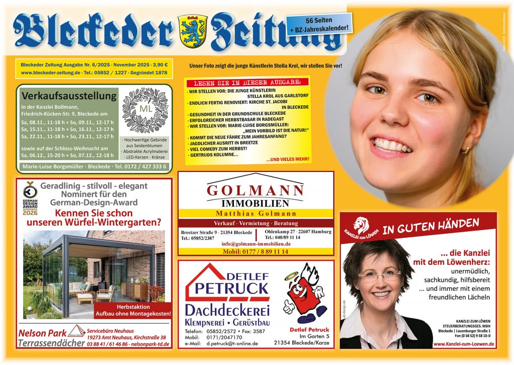 Ging es in der letzten Ausgabe auf zahllosen Sonderseiten um Brücke und Schützenfest, liegt der Schwerpunkt der aktuellen BZ diesmal auf ganz anderen Themen. Wir stellen zwei Damen vor, die ihr Augenmerk auf Kunst und Ästhetik legen: Stella Krol und Marie-Luise Borgsmüller beweisen, dass Bleckede und seine Ortsteile viel mehr zu bieten hat als schöne Landschaft und gute Luft!